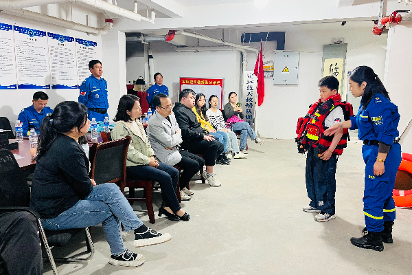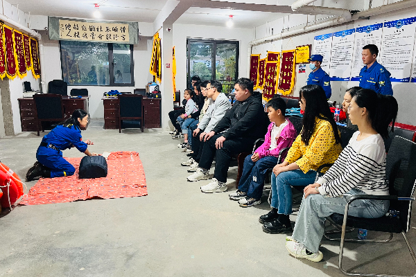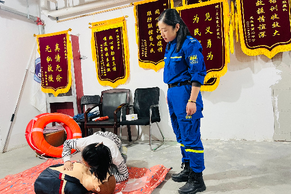 “场景式+情景式”的教育方式,是学习急救知识最直观的真实体验。在蓝天救援队队部里,青年学员们跟着蓝天救援队队员,进行逐个板块学习和互动体验,学习并体验了心肺复苏急救法、气道异物急救法、外伤止血、骨折处理、溺水急救、触电急救、烫伤急救、中暑急救、食物中毒急救等知识与技能。