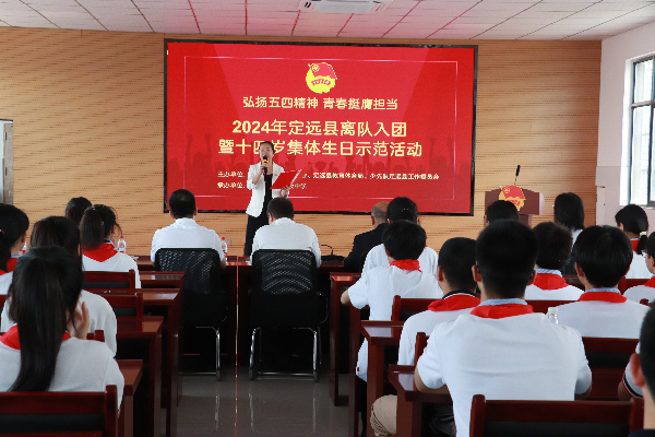 为深入学习贯彻党的二十大精神和习近平总书记关于青年工作的重要思想,践行党、团、队一体化培养体系要求,引导和激励定远广大青少年继承和发扬五四精神,厚植爱国情怀,5月15日上午,由团定远县委、定远县教体局、定远县少工委主办,定远县第三初中承办的“弘扬五四精神 青春挺膺担当”2024年定远县离队入团暨十四岁集体生日示范活动在定远县第三初中成功举办。团县委、县教体局、县少工委、第三初中相关负责同志参加。 活动开始,县委教体工委副书记黄如勇向光荣离队和光荣加入共青团的同学表示祝贺,并祝同学们十四岁集体生日快乐!同时,向广大青年提出三点希望,一是坚定信念,争做志存高远的有志青年;二是勤学善思,争做好学向上的有知青年;三是明辨笃行,争做崇德向善的有德青年。