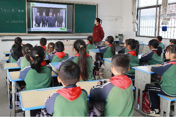 主题队会活动在优美动听的《六尺巷》歌曲中开启,队员们一边聆听,一边轻唱,整个场面非常温馨动人。接着,大家一起观看了习近平总书记考察桐城六尺巷的视频,静静聆听习近平总书记的谆谆教诲。
