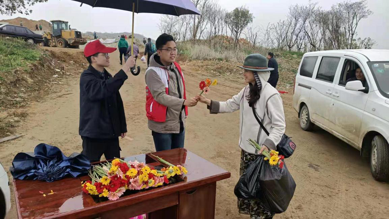活动期间,志愿者们头带小红帽,冒雨对来公墓祭扫的市民进行文明安全祭扫宣传,提倡用鲜花祭祀、网上祭祀等安全、绿色、环保方式祭奠、缅怀亲人,并在现场提供鲜花供市民使用。同时,不使用塑料花及其他不易降解的布花、绢花、锡箔纸花等祭祀品,倡导文明祭扫,还清明节以清明洁净。