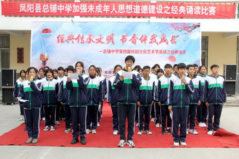 为弘扬民族优秀文化,传承中华文明,打造书香校园,激发同学们对祖国语言文字的热爱,全面提升同学们的语言文字应用能力和综合素质,打造“市级文明校园”,12月14日,凤阳县总铺中学隆重地举行了校园文化艺术节之经典诵读比赛活动,本次活动由学校团委筹划承办。