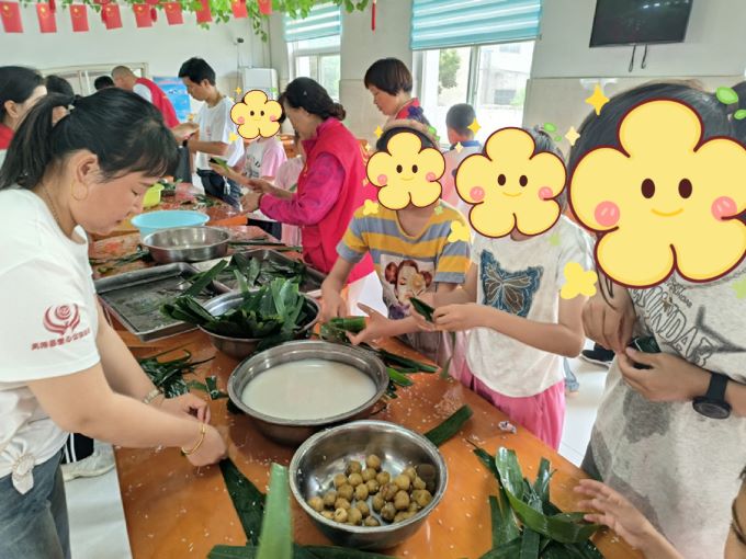 活动中,志愿者准备好糯米、粽叶、蜜枣等食材和工具和孩子们一起包粽子。洗粽叶、捋粽叶、填糯米、放蜜枣、压紧实、绑粽绳,大家巧手翻飞,现场欢声笑语不绝于耳。包好粽子后,孩子们与志愿者共同为每位老人系上平安扣,送上馓子和鸭蛋,一同送上的还有孩子和志愿者对老人们生活圆满、健康平安的美好祝福。孩子们也在这次敬老活动中感受到了传统节日的美好、传统美德的魅力。