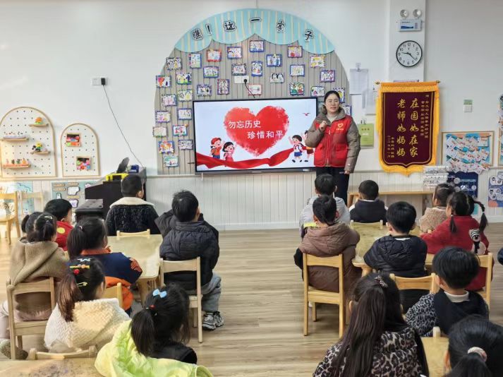 活动伊始,青年志愿者用通俗易懂的语言,向孩子们缓缓讲述国家公祭日的由来与意义,结合适合幼儿理解的历史片段,深入浅出地介绍南京大屠杀那段山河破碎、同胞受难的悲痛历史。让孩子们明白,设立国家公祭日是为了缅怀死难同胞,铭记侵略战争带来的深重灾难,更是为了凝聚民族力量,守护来之不易的和平。志愿者们还详细讲解了人民纪念遇难同胞的多种方式,从肃穆的公祭仪式到各地的纪念活动,让孩子们感受到全社会对历史的敬畏与对和平的珍视。同时,志愿者们以“祖国有我,守卫和平”为主题,引导孩子们从小树立爱国信念,将个人成长与国家命运紧密相连。