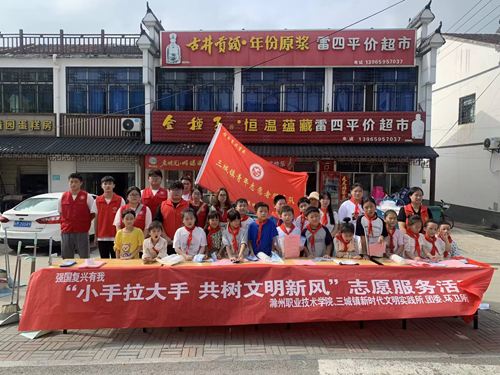 为进一步优化辖区面貌,打造洁净有序、和谐优美的人居环境,并贯彻学生成长成才全过程的党、团、队一体化建设新格局。三城镇联合滁州职业技术学院师生开展的“引领少先队员走进街道 助推新时代文明实践”志愿服务活动。
