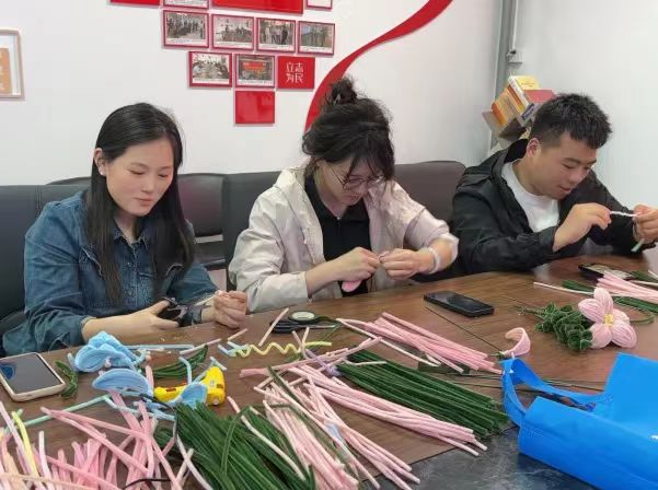 活动开始,志愿者首先为大家介绍扭扭棒的起源和历史。扭扭棒也叫仿绒花条。绒花制作始于唐代,谐音“荣华”,寓有吉祥、祝福之意。绒花条制作过程繁琐,仿绒花条外观与绒花条相似,且制作简单,并不需要繁琐的工序,即可体验毛茸茸的花朵带来的视觉享受。介绍完扭扭棒,志愿者进行了示范,大家认真地聆听并跟随志愿者的步骤,边看边听边学,让手上的扭扭棒动了起来,经过2个小时的制作,一朵朵栩栩如生的扭扭棒小雏菊便呈现在眼前。看着自己亲手制作的绚烂花朵,大家纷纷露出满意的笑容,一名学员说道:“第一次见这个扭扭棒,还挺好玩的,居然可以做成这么漂亮的花束”。