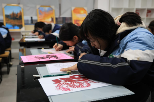 美术教室里,同学们在老师的指导下,用心探索黑白版画的独特魅力,用刻刀在雕板上雕琢梦想,用油墨在纸张上留下青春的印记。同学们用心创作,一条条金蛇“飞舞”在木板上,时而腾空而起、时而盘旋游走,惟妙惟肖,栩栩如生,充分运用艺术造型,表达对平安喜乐、吉祥如意的期冀与追求。