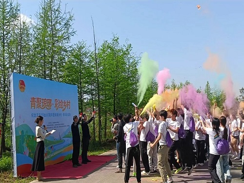 活动正式开始前,全体人员齐唱《光荣啊,中国共青团》,激昂的团歌回荡乡野,激扬爱国情怀。随着清脆鸣笛声,彩虹粉漫天飞扬,青年们迎着春风,奔跑在风景如画的西涧渡村环湖绿道上。
