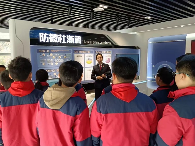 通过“知法懂法篇”的学习,学生们进一步认识到法律法规对于社会和谐发展的关键作用。讲师详细解读了未成年人保护法的相关内容,帮助同学们理解自身权益的同时,也明确了作为社会一员应尽的责任。活动现场气氛热烈,同学们踊跃提问,展现了对法律知识的渴望。为了增强学生的安全防范意识,活动特别设置了“防微杜渐篇”。这一环节通过图表、数据以及真实案例的展示,让学生深刻体会到预防犯罪的重要性。同学们围站成半圆形,专注倾听讲解员的分享,纷纷表示将把所学知识运用到日常生活中,远离不良行为,争做守法好少年。警示教育展区为学生们提供了深刻的反思机会。“警示教育篇”以多媒体形式呈现,通过视频演示和互动体验,让学生直观感受到违法行为可能带来的严重后果。这种寓教于乐的方式不仅加深了他们的记忆,还提升了自我约束力。活动尾声,“与未来对话”互动墙成为亮点之一。借助高科技教学工具,学生们亲身体验了现代法治教育的魅力。他们纷纷表示,这样的学习方式既有趣又实用,能够更好地帮助自己树立正确的价值观。