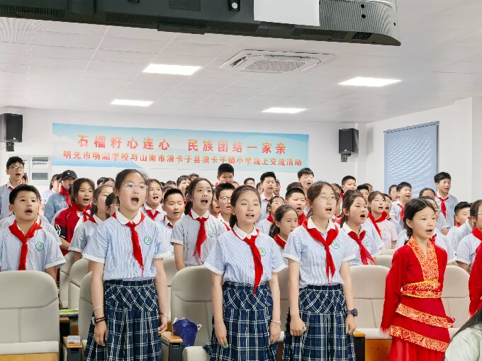 此次活动由共青团滁州市委、滁州市青年联合会统筹策划,明光市委统战部、共青团明光市委、明光市明湖学校共同承办。活动中,明光市明湖学校与山南市浪卡子县浪卡子镇小学开展了线上交流——“石榴籽心连心 民族团结一家亲”云连线活动。启动仪式在明湖学校顺利举行。明光市委统战部常务副部长张素来、团市委书记李志强及浪卡子县委统战部常务副部长次旺桑布、群团工作部副部长次仁卓嘎出席,明光市与西藏浪卡子县两地200余名师生通过线上平台以文化为媒,共话民族团结。