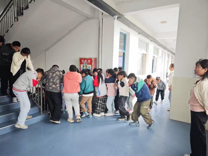 随后,学校组织全体师生开展应急疏散演练。警报响起后,学生在教师引导下用衣袖或书本遮挡口鼻,弯腰低姿沿预定路线快速撤离。各楼层值班教师现场维持秩序,确保过程安全有序。全体师生仅用48秒即完成撤离,安全抵达操场指定区域,各班及时清点人数,确保无一人遗漏。