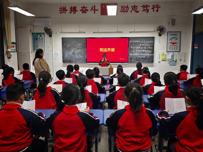 活动现场庄重有序、氛围热烈。各班教师借助多媒体课件,以通俗语言解读国家宪法日的设立背景、重要意义及宪法的根本大法地位。结合校园生活案例与法律小故事,老师们深入浅出阐释公民权利与义务,让“法律面前人人平等”“受教育既是权利也是义务”等理念扎根学生心中,夯实认知基础。