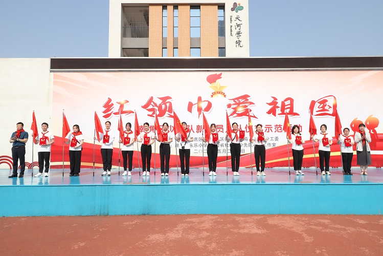随后,雄壮高昂的旋律响起,同学们齐声唱响《中国少年先锋队队歌》,永乐小学副校长宣读新队员名单。小小红领巾,代代永流传。在同学们热切的目光中,老队员齐步向前,手捧光荣象征的红领巾,庄重地为新队员们佩戴仔细,并互敬队礼。鲜艳的红领巾在胸前飘扬,校少先大队副大队长带领全体队员右拳紧握、表情肃穆,在星星火炬旗帜下进行了庄严宣誓。