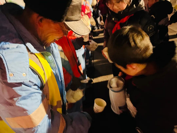 1月1日凌晨4点,参与活动的青少年及其家长带着由青少年自己煮好的姜茶早早地来到了活动场地,他们在滁州市农歌会广场和人民广场集体发声:“一杯姜茶,温暖中国,我在滁州向大家问好!”。随后,青少年志愿者们在家长的带领下分别来到了滁州中西结合医院、滁州火车北站、丰乐菜场、滁州市农歌会广场以及滁州人民广场环卫集合点,向凌晨工作者们送上一杯姜茶、一份早餐。活动中,青少年志愿者们与这群凌晨工作者进行深入交流,仔细聆听着每一份工作背后的故事,感受凌晨工作的不易。
