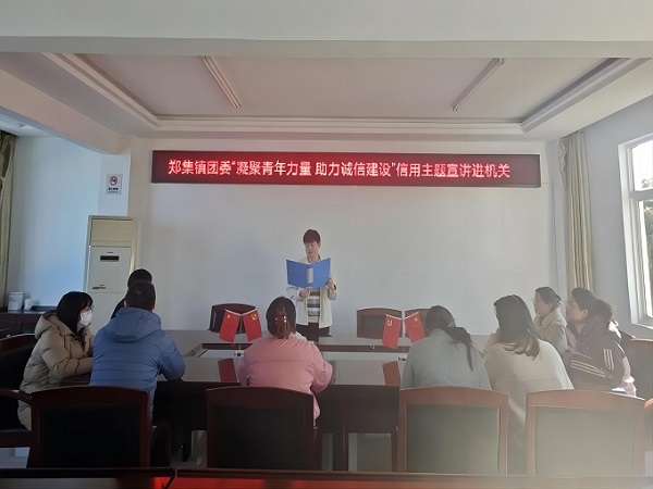 为引导广大团员青年积极参与社会信用体系建设,营造诚实守信的社会氛围,近日,郑集镇团委联合镇司法所、综治中心开展“凝聚青春力量 助力诚信建设”信用主题宣讲进机关活动。