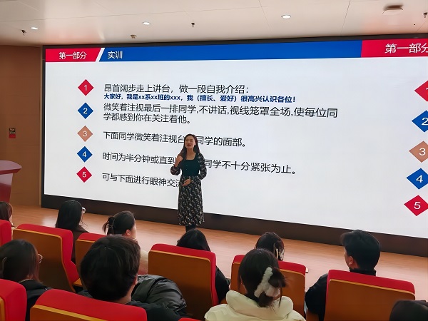 课程伊始,赵老师首先介绍了演讲的基本原则,如放慢速度、眼神交流、用精炼的语言做总结等。其中,特别强调了眼神交流的重要性,她指出,与所有听众进行眼神交流能够增强演讲的感染力。