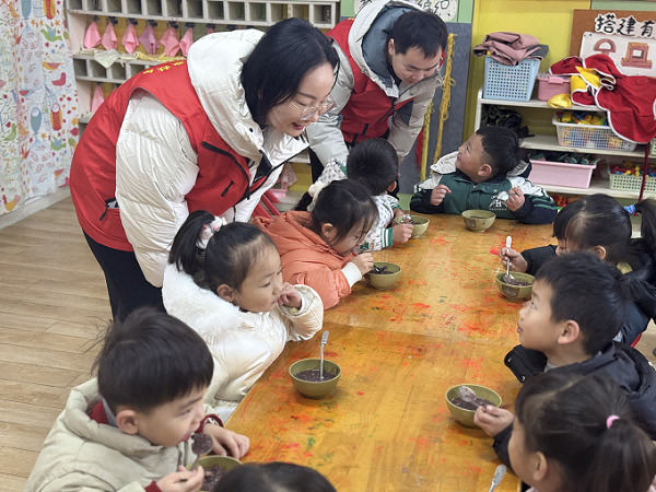 “软糯香甜腊八粥,团圆甜蜜聚福气”。活动中,青年志愿者们通过播放视频、阅读绘本等方式,让孩子们了解了腊八节的来历和习俗。随后,幼儿园小朋友们纷纷化身为小小魔法师,与青年志愿者们一起探索腊八粥的魔法配方。小朋友们说,红豆是勇敢的小骑士,红枣是机智的小精灵,糯米则是温柔的公主……每一种食材都被赋予了独特的故事和角色。小朋友们品尝着热气腾腾、香气四溢的腊八粥,感受着其中的奇妙与温馨。