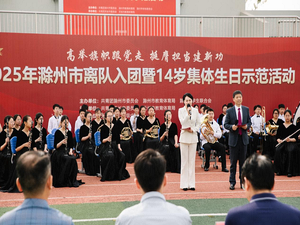 薪火相传正青春,挺膺担当向未来。5月27日上午,由共青团滁州市委、滁州市教育体育局、滁州市学生联合会主办,共青团天长市委、天长市教育体育局、天长市同心初中承办的2025年滁州市离队入团暨14岁集体生日示范活动成功举办。各校团委负责人、大队辅导员以及现场师生、团员代表、家长代表等700余人参加活动。团滁州市委书记李国金、副书记万小宇,天长市委副书记阚绪瑞,天长市委教体工委书记、教体局局长叶晓东,团天长市委书记杨佳丽,天长市教育体育局副局长周家华等出席活动。