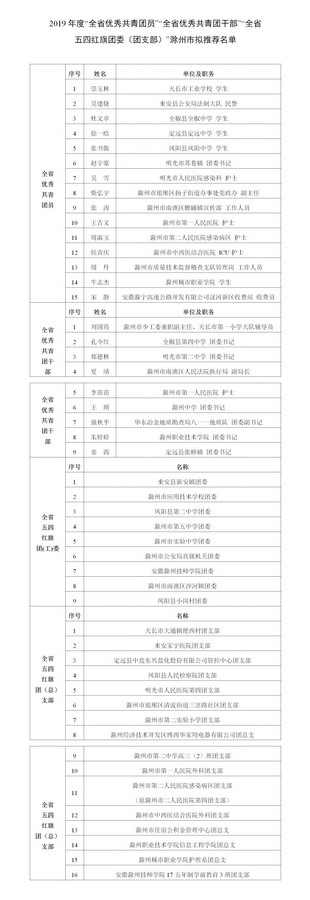 附件:《2019年度“全省优秀共青团员”“全省优秀共青团干部”“全省五四红旗团委(团支部)”滁州市拟推荐名单》