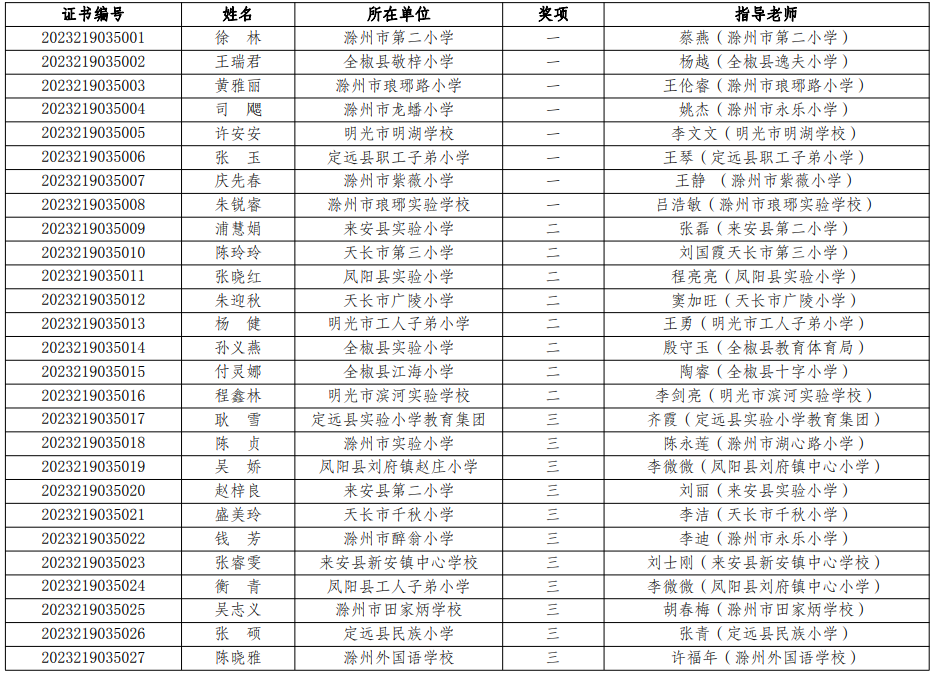 根据《关于举办2023年滁州市少先队活动优质课评选活动的通知》(滁青联〔2023〕33号) 要求,经组织专家评选,共评出一等奖8人,二等奖8人,三等奖11人,现将评审结果予以公示。公示时间为2023年10月20日-26日。公示期内如有异议,请向市教科院或市教体局机关纪委反映并提供书面材料,个人反映请署真实姓名和联系电话,单位反映请加盖公章。