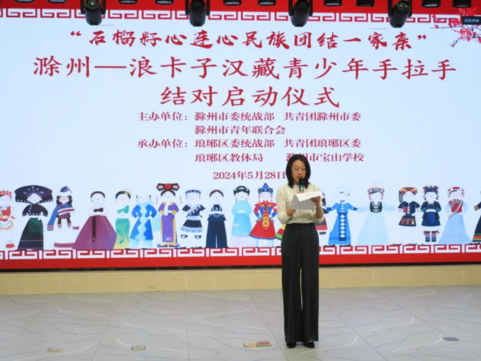 为认真贯彻习近平总书记在新时代推动西部大开发座谈会上重要讲话精神,深化青少年民族团结教育,铸牢青少年中华民族共同体意识,5月28日,由滁州市委统战部、共青团滁州市委、滁州市青年联合会主办,浪卡子县委统战部、共青团浪卡子县委、琅琊区委统战部、共青团琅琊区委、琅琊区教体局等承办的“石榴籽心连心 民族团结一家亲” 滁州—浪卡子县汉藏青少年手拉手结对启动仪式在滁州市宝山学校、西藏山南市浪卡子县中学成功举办。活动以云端连线方式举行,汉藏各100名青少年成功结对,并认领“微心愿”。团滁州市委副书记、市青联主席戴莺,琅琊区委常委、统战部部长王光之、浪卡子县统战部常务副部长次旺桑布等主办单位、承办单位领导出席启动仪式。