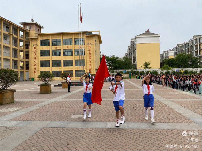 入队仪式前,大队辅导员王苗苗组织各中队开展有效的队前教育,达到“六知、六会、一做”的入队基本标准。仪式在出旗曲中开始,少先队员行队礼、三位旗手迈着坚定地步伐,目光炯炯,走向主席台中央。出旗仪式后,四年级的老队员们为一年级的新队员戴上红领巾,随后新队员们在国旗下庄严地宣誓。从新队员们坚毅的眼神中,我们看到了希望的延续,相信他们一定会在星星火炬的指引下,好好学习,在中国共产党的领导下,向着光明的未来前进。