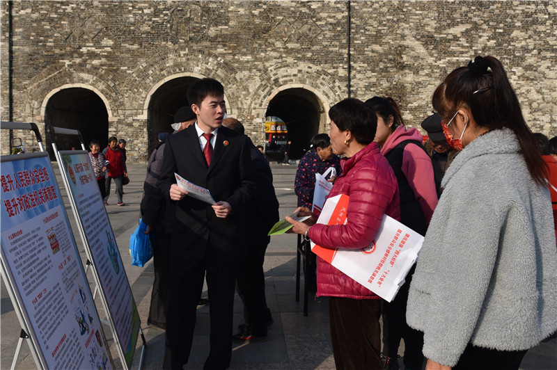 举行广场宣讲。在鼓楼广场,青年干警们以悬挂横幅、设置宣传台、集中宣讲、个案解析的方式,用通俗易懂的语言、真实典型的案例,向附近居民和过往群众讲解电信网络诈骗手段、危害和预防对策,宣讲“双提升”工作的意义及重要性,引导群众学法懂法守法用法,积极参与安全感和满意度民意调查活动。