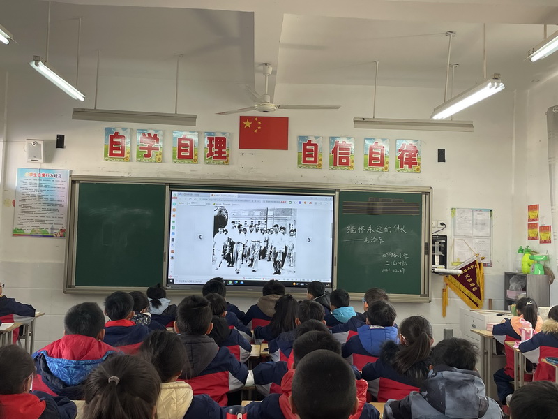 12月27日,利用升旗仪式,开展国旗下讲话,升旗仪式结束后,各中队开展纪念毛泽东主题队会,从毛泽东同志生平事迹、革命足迹、豪迈诗词、丰功伟绩等方面展现一代伟人的巨大成就,带领少先队员们追寻伟人成长足迹,牢固树立红色基因,从小树立远大理想,争做新时代合格少先队员。
