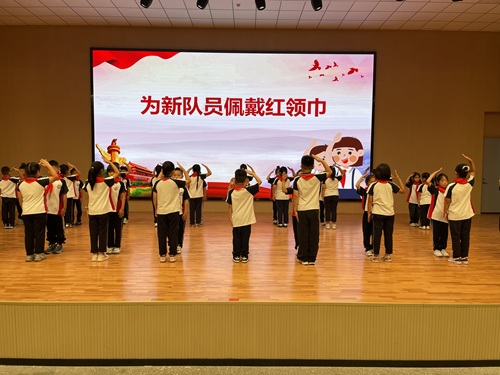 伴随着铿锵有力的出旗曲,旗手高擎大队旗阔步入场,入队仪式正式拉开帷幕。全体少先队员齐敬队礼、高唱队歌,嘹亮歌声响彻报告厅。随后,大队辅导员宣读新队员名单,老队员为新队员佩戴红领巾,新队员面向队旗庄严宣誓,光荣加入中国少年先锋队。