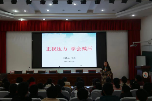 同时,在学校报告厅还有来自滁州职业技术学院社会心理服务中心的杨画老师为七年级学生开展关于《正视压力,学会减压》的心理健康讲座。杨老师通过一系列精心设计的游戏互动、情景模拟等教学环节,以生动有趣、通俗易懂的语言,引导学生现场练习减压的方法和技巧,赢得了在场学生的热烈反响与好评。