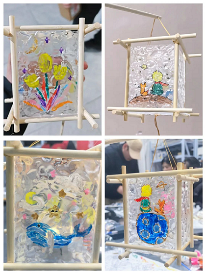 活动现场,由星圆艺术中心的天天老师先为大家讲解了花灯的起源及寓意,接着将制作琉璃花灯的手工材料分发给大家,并详细讲解了琉璃花灯制作的步骤和需要注意的细节,大家先用颜料在“琉璃”片上进行创意绘画,再用木棍组装框架,按创意设计用热熔胶精心粘贴。待热熔胶初步固化后,安装底座和灯串,一会功夫,一个个漂亮的灯笼呈现在眼前。