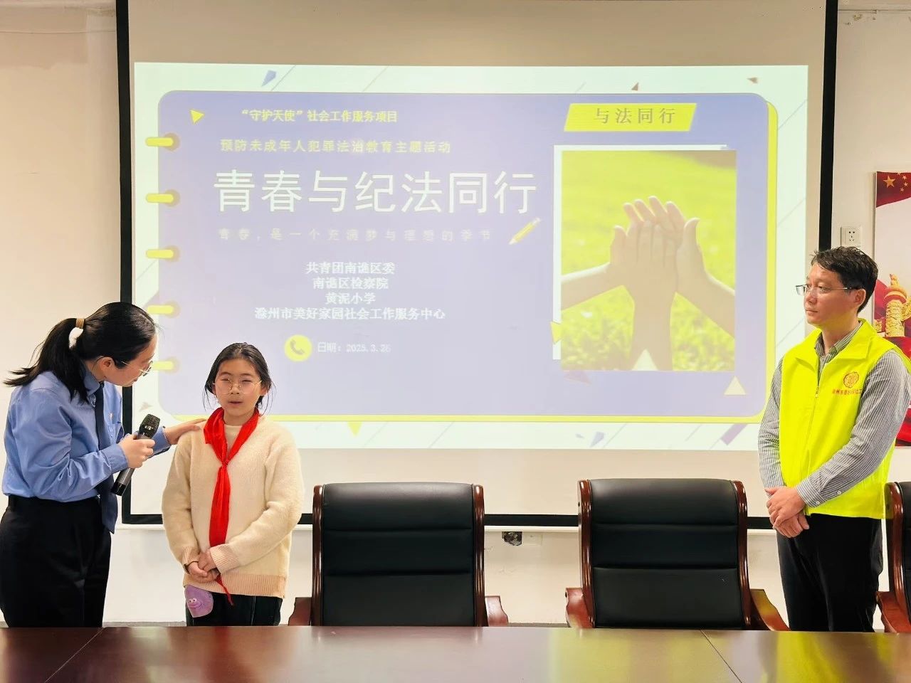近日,团南谯区委在黄泥岗镇小学开展守护天使项目“青春与纪法同行”预防未成年人违法犯罪主题活动。