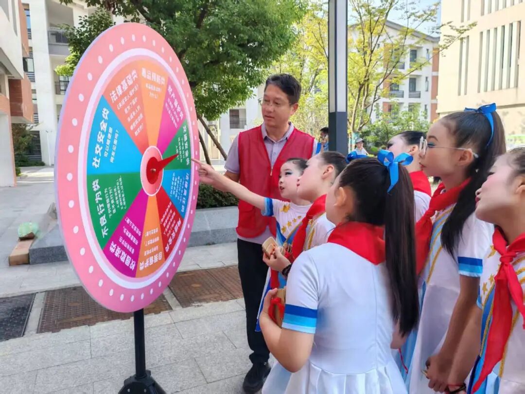 各部门结合各自职能开展了法治宣传活动:公安分局民警通过真实案例讲解违法犯罪危害及自我防护技巧,区法院法官依托《民法典》阐释司法公正与社会各方责任,团区委、区妇联等部门则重点关注学生心理健康,引导他们树立积极人生态度。活动现场气氛活跃,其中最受欢迎的是“法治互动轮盘”,采取“物料宣传+趣味互动”的方式普及法律知识。轮盘设置有交通、法律、网络安全等10个主题区域,对应的是不同的法治问题。同学们通过转动轮盘即可参与有奖问答,在轻松互动中增强学法兴趣,提升法治意识。