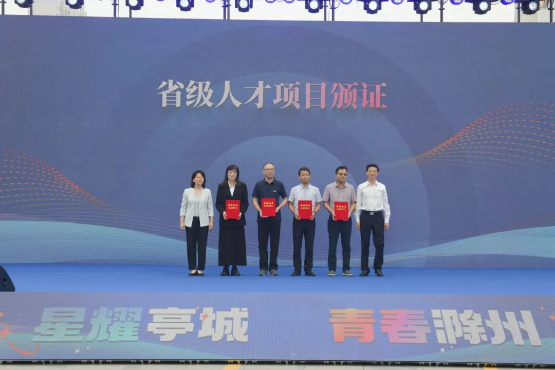 周文芳、姚志江为4名省级人才项目入选者颁发证书,共同见证滁州市满天星青年人才街区正式开街。