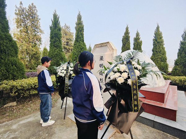 在梁明伦烈士陵园,学子们衣着整齐,神情庄重,面向烈士纪念碑肃立。学生代表迈着沉稳的步伐走向纪念碑,敬献花圈,以表达对烈士的深切缅怀。全体人员随后默哀三分钟,默哀结束后缓步绕陵园一周,瞻仰烈士陵墓。