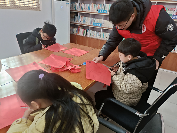 “小朋友们,要先按照数字标注的顺序将图案折叠起来,再沿着虚线的位置进行裁剪,注意握剪刀的姿势要稳、要准,遇到转弯的地方,转动纸张来配合就行……”青年志愿者们一边耐心讲解剪纸技巧,一边亲自示范折剪步骤,不一会儿,一张普通的彩纸脱胎换骨,一个精致漂亮的窗花跃然纸上,引得在场小朋友惊叹连连,迫不及待地想动手尝试。