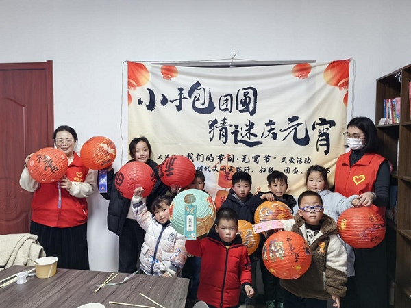 吃完汤圆后,青年志愿者们带着孩子们参与猜灯谜活动。五彩斑斓的灯笼下悬挂着内容丰富多样的灯谜,不仅有充满趣味的传统字谜,还涵盖了党团知识、垃圾分类、水源保护等各类知识。孩子们踊跃回答,现场气氛热烈。