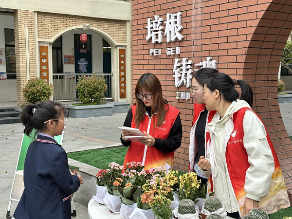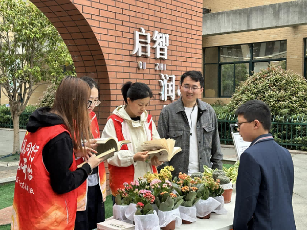 活动现场,青年志愿者们提前在地上摆好种类多样的绿植,等待学生们带书交换。按照要求,只要七成新以上且无缺页、污损的正式出版读物就可以置换一盆多肉植物。在交换环节之前,志愿者们先是向学生们介绍了世界读书日的设立意义,并邀请了部分学生分享他们喜爱的书籍。大家兴趣高涨、踊跃参与。分享结束后,同学们陆续带着自己阅读过的旧图书前来参与活动,他们把旧图书交到志愿者手中后,换取了一盆喜爱的绿植,脸上洋溢着幸福的笑容。