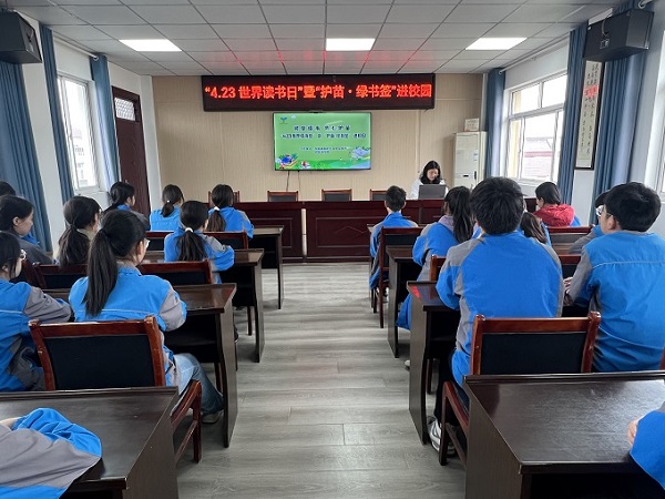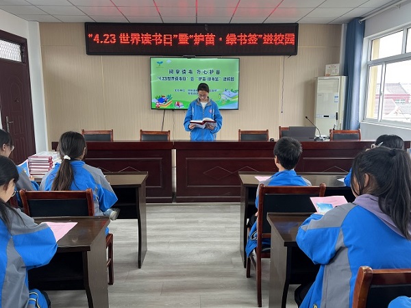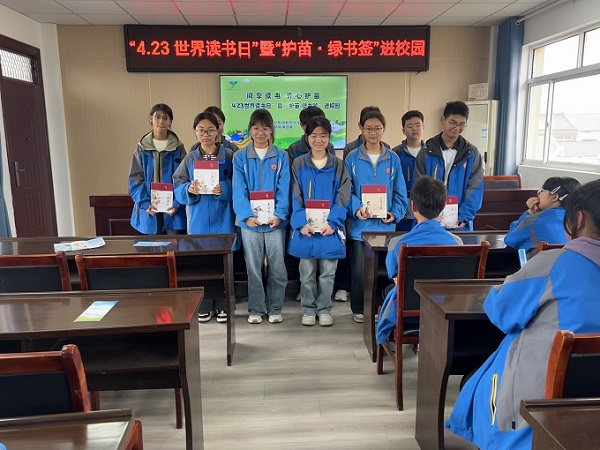 绿签净网护青苗,书香筑堤御浊流。“一本好书是良师益友,一本坏书则可能成为‘精神毒药’!”镇团委书记以《书香致远 护苗同行》为题,为师生解读“世界读书日”与“绿书签行动”的双重意义。她手持正版书籍与盗版印刷品对比,直观展示错别字、模糊插图对阅读体验的损害;通过“AI虚假荐书”“网络暴力小说诱导充值”等真实案例,警示不良信息对青少年的侵蚀。“这枚绿书签是纯净阅读的‘通行证’,更是抵御文化侵蚀的‘护城河’!”她高举绿书签,向师生发出“护苗同行”倡议。活动现场,青年志愿者为每名学生发放定制绿书签,指导他们在“护苗承诺树”上按下彩色手印——100余片“绿叶”顷刻间交织成荫,以青春之名共守“文化晴空”。