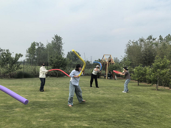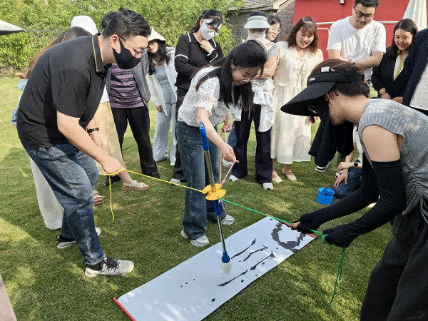 在“盲人剑客”游戏中,蒙上双眼的队员根据听觉找到对手,攻击淘汰对方;在“神笔马良”活动里,三人一组配合操控一支毛笔,合作写作“五四”二字。在这些充满趣味与挑战的活动中,青年们深刻体会到团结协作的力量。大家相互信任、相互支持、默契配合,不仅增强了团队凝聚力,更激活了青春力量。