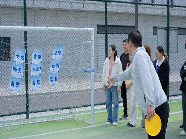 第三环节为“飞盘打靶·知廉扬清”。此环节创新性地将廉洁教育与趣味运动相结合。九宫格上粘贴有“违纪”“舞弊”等字样,队员们通过飞盘击打这些负面词汇,象征着对这些行为的坚决抵制。成功完成挑战的队员获得了“廉”字印章,寓意着对廉洁精神的坚守与弘扬,彰显五四青年保持初心、砥砺奋进的青春力量。