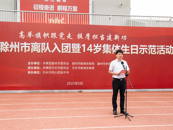 薪火相传正青春,挺膺担当向未来。5月27日上午,由共青团滁州市委、滁州市教育体育局、滁州市学生联合会主办,共青团天长市委、天长市教育体育局、天长市同心初中承办的2025年滁州市离队入团暨14岁集体生日示范活动成功举办。各校团委负责人、大队辅导员以及现场师生、团员代表、家长代表等700余人参加活动。团滁州市委书记李国金、副书记万小宇,天长市委副书记阚绪瑞,天长市委教体工委书记、教体局局长叶晓东,团天长市委书记杨佳丽,天长市教育体育局副局长周家华等出席活动。