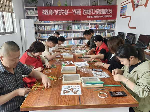 竹艺赋新承古韵,青匠织就生态美。川桥村农家书屋内,一场“竹编里的端午密码”非遗课堂正火热开展。青年工匠们以染色彩篾为经纬,在压挑交错间编织出艾虎驱毒、龙舟竞渡、一举高“粽”等端午图景。“我们特意选用可降解环保材料,让千年技艺焕发绿色生机。”志愿者小李边编织边介绍。20幅融合节气美学与环保理念的竹编作品在文明实践站展出,既有《青绿山水粽》的写意,也不乏《生态龙舟》的巧思,传统工艺在青年手中绽放出时代光彩。