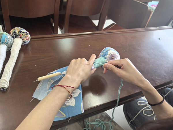 活动现场设置“文化课堂+实践工坊”双场景。在非遗手作老师的指导下,大家首先聆听了端午节起源、艾草文化寓意及艾草锤历史典故的讲解,随后便投入到手工制作中。裁剪布料、缝制布袋、填充艾草与棉絮、收口绑扎、装饰流苏……大家围坐一桌,穿针引线间互相交流技巧,分享各自记忆中的端午习俗,现场洋溢着欢乐祥和的节日气氛。青年干部小张笑着展示自己的作品:“第一次做手工锤,没想到艾草的香味这么清新,既实用又有纪念意义!”