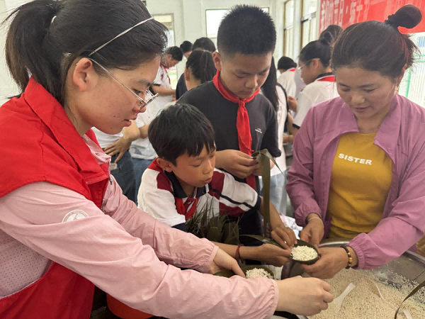 活动伊始,青年文化志愿者通过生动的知识普及和趣味盎然的互动问答,向参与活动的学生们讲解了端午节的深厚文化底蕴与丰富习俗。从屈原的爱国情怀到赛龙舟的激昂、吃粽子的温馨、佩戴五彩绳的祈福,同学们在轻松愉快的氛围中沉浸式感受传统文化的魅力,不断加深对民族文化的理解与热爱。随后,活动进入了孩子们翘首以盼的动手环节——包粽子。大家热情高涨,纷纷动手尝试。折粽叶、填糯米、放馅料、捆扎绳……这些亲手制作的粽子,形态各异、充满童趣,不仅承载着节日的喜悦和传统文化的韵味,更包裹着团组织和青年志愿者对孩子们的美好祝福。