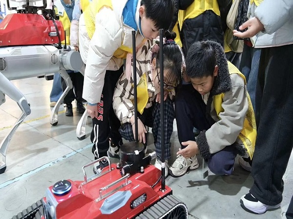 活动首站,孩子们抵达位于滁州高新技术产业开发区的安徽海马特救援科技股份公司。在讲解员的引导下,孩子们近距离观察了适用于不同场景的消防车辆,了解了机器人技术在抢险救援中的应用。企业拥有的53项国家专利和13项软件著作权,以及与中国科学技术大学等高校的产学研合作,让孩子们直观感受到“科技让救援更智能”的现实图景。不少孩子对展示的消防机器人表现出浓厚兴趣,纷纷提问互动,在心中播下了科学与安全的种子。