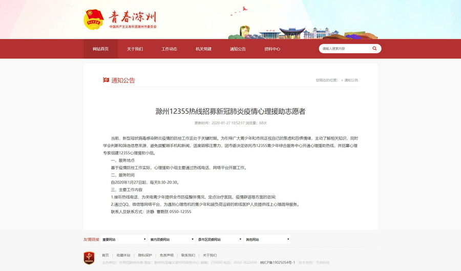 疫情就是命令,防控就是责任。接到任务,滁州12355疫情心理援助热线立即开通,招募12355疫情心理援助志愿者,通过接听热线电话或QQ、微信等平台,为青少年提供防疫整体情况、定点治疗医院、疫情辟谣等方面的咨询和线上心理疏导服务,引导广大青少年正视自己的焦虑和恐惧情绪,主动了解相关知识,帮助青少年学会判断和筛选信息来源,避免频繁刷手机和新闻,适度转移注意力。