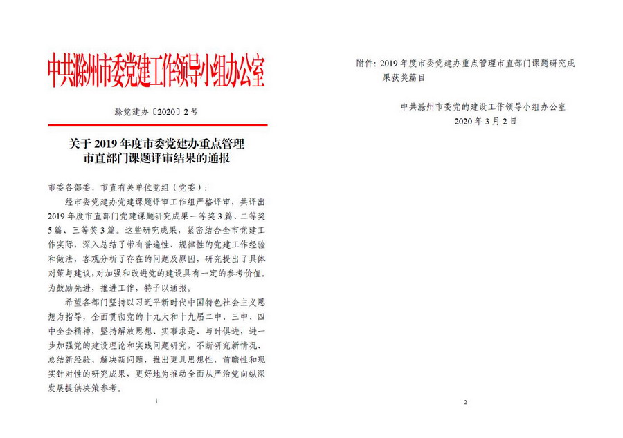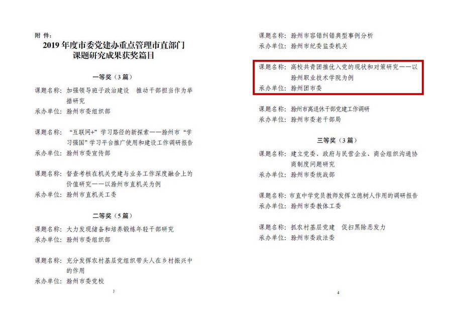日前,经市委党建办党建课题评审工作组评审,团市委、滁州职业技术学院团委共同组织完成的《高校共青团推优入党的现状和对策研究——以滁州职业技术学院为例》课题成果,获得2019年度市直部门党建课题研究成果二等奖。